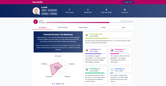 We provide the Forecast Persona, a breakdown of several attributes related to your prediction ability, such as confidence, reactivity, and timeliness. Are you ‘The Sniper’, who makes confident forecasts early and rarely updates? Or are you ‘The Whirlwind’, who updates their forecasts dramatically, by following the news cycle closely?